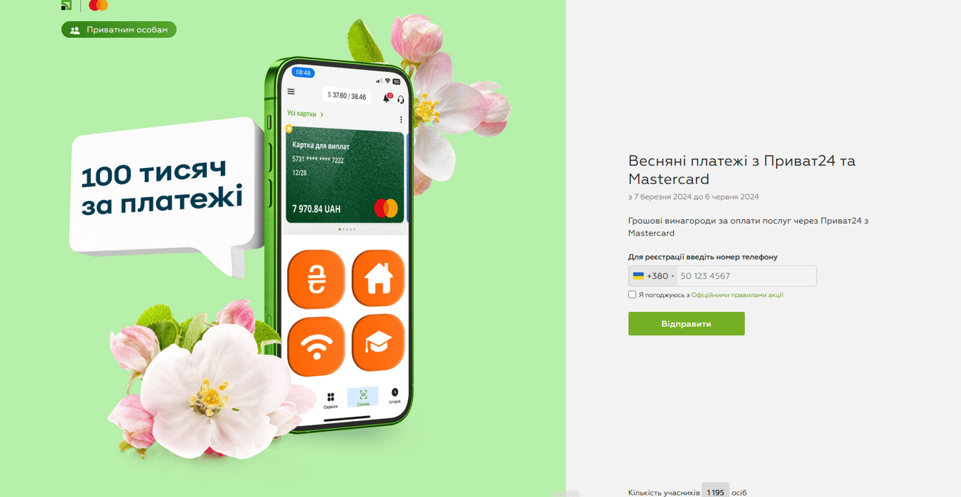Долучитися до розіграшу "Весняні платежі з Приват24 та Mastercard" можна із 7 березня до 6 червня 2024 року. Для участі в акції потрібна попередня реєстрація за посиланням.